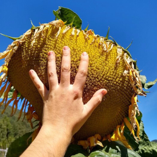 To start seeds, plant them 3-5 cm deep and about 15 cm apart in your well-prepared bed. If you have an abundance of seeds, plant them closer and thin to the strongest seedlings when they reach 15 cm tall. Water them in well and keep the soil moist. Netting can be placed over the bed to keep birds and other critters from sneaking off with your freshly planted seeds. Mulch can also be spread over the bed to help retain moisture and suppress weeds while sunflowers germinate and to get established. Water deeply and infrequently when plants are established.